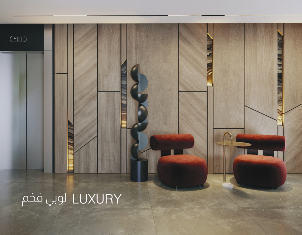 لوبي فخم، جودة فاخرة، مساحات مشتركة لاستخدام السكان كنادٍ اجتماعي أو قاعة محاضرات أو صالة رياضية.